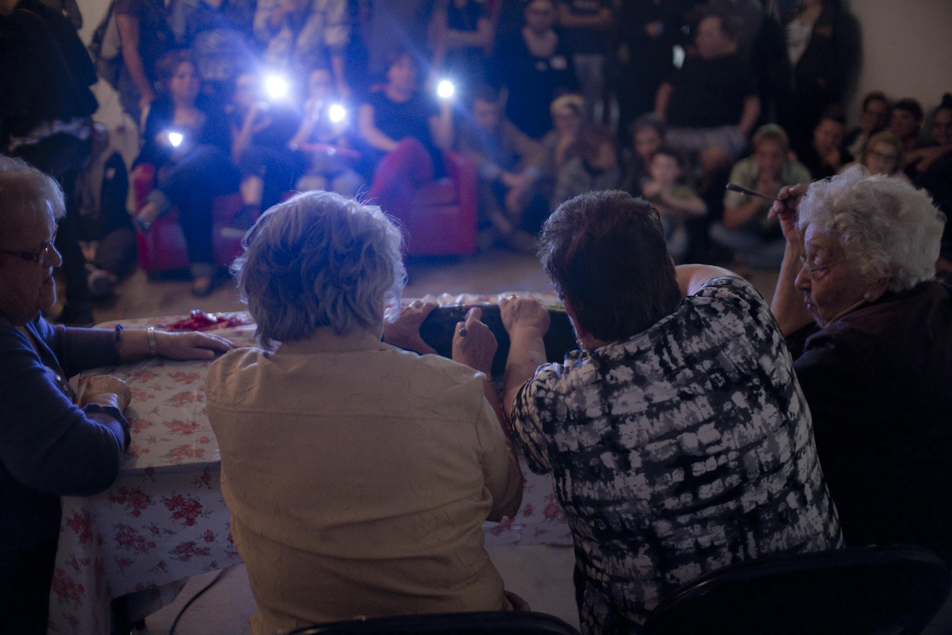 Invitation des commissaires Julie-Andrée T. et Constanza Camelo-Suarez pour le centre d’artistes Le Lobe dans le cadre des Rencontres Internationales des Arts de la Performance – RIAP, au Saguenay. Avatars est une performance réalisée en collaboration avec quatre dames âgées d’environ quatre-vingt ans. Canevas. Quatre dames arrivent dans des boîtes de réfrigérateur. Elles tiennent une Poulpe par la main. À l’aide d’exacto elles sortent de leur boîte en découpant la silhouette d’une des Poulpes puis les quatre dames vont à une table et détruisent une courge à l’aide d’ustensiles. Les Poulpes partagent un énorme plat de pop corn. Rose, bien entendu.